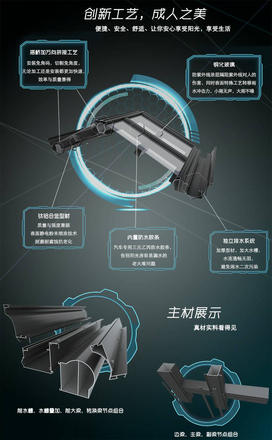 镀锌铝合金结构,高强度防止紫外线钢化玻璃,不变形不变色,历久弥新。