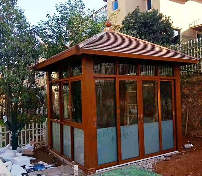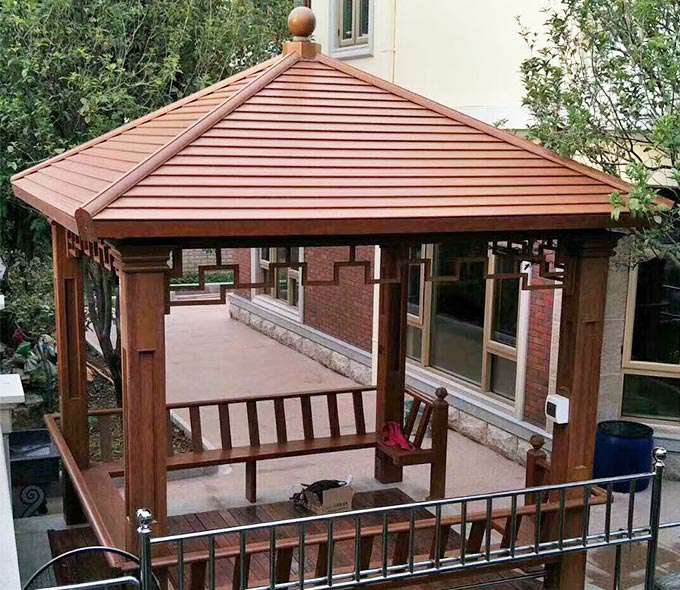 成都笑宇人工智能服务有限公司凉亭系列产品是采用高强度铝合金为原材料,经酸洗铬化,电泳或静电喷涂,木纹转印处理后,精密定制设计,保障安装。它具有防水防潮,不膨胀不变形,防腐蚀,具有逼真的木质感。成为别墅住宅及市政园林等建筑美丽的风景。